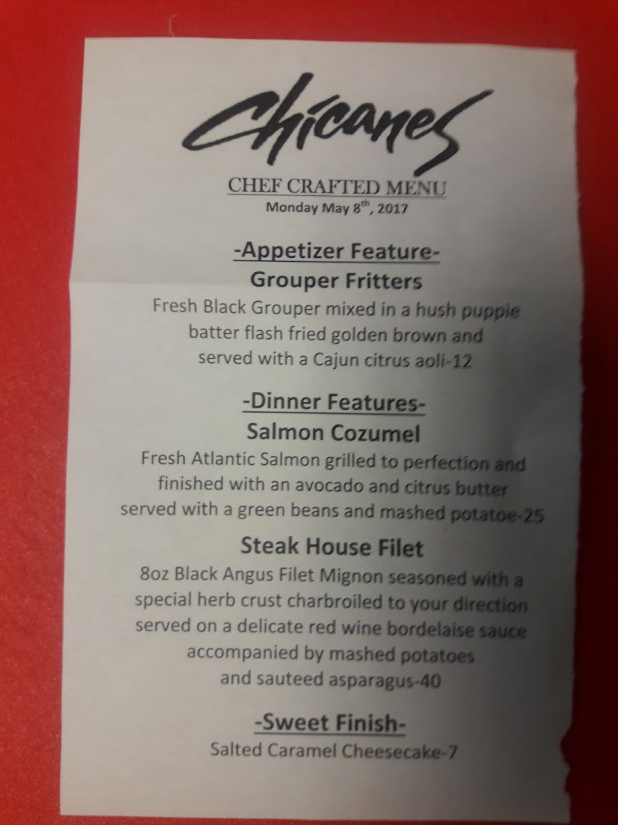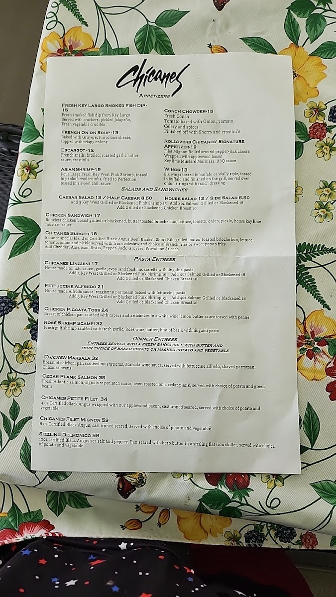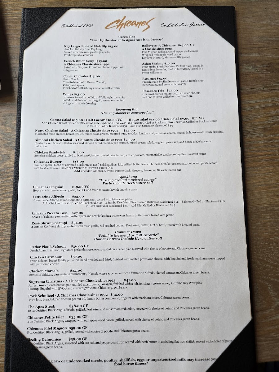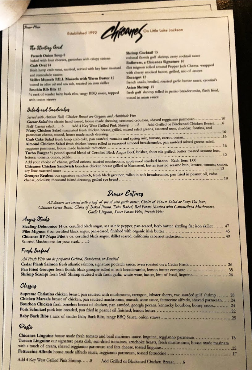 Chicanes Restaurant & Bar, your culinary escape nestled at 3101 Golfview Rd, Sebring, FL. Our menu is a delightful tapestry of flavors that showcases seasonal ingredients and classic preparations. Dive into our French Onion Soup for a rich, savory start, or savor the decadence of our creamy Creme Brulee to satisfy your sweet tooth. For seafood lovers, our Skillet Mussels and Cedar Plank Salmon offer a taste of the ocean that's hard to resist. Don’t miss out on our signature dishes like Chicken Marsala and the Turbo Burger, each crafted to tantalize your taste buds. Pair your meal with a refreshing Mojito or a glass of our house-made Sangria, and round off your dining experience with a luxurious Chocolate Martini. Whether you're in the mood for a casual dinner or a special celebration, the Chicanes Restaurant & Bar Menu has something for everyone!