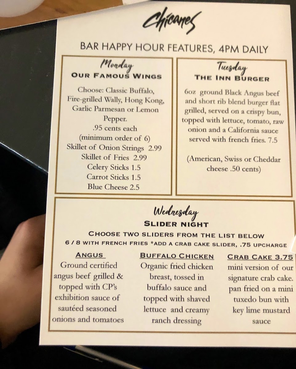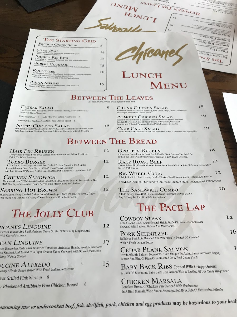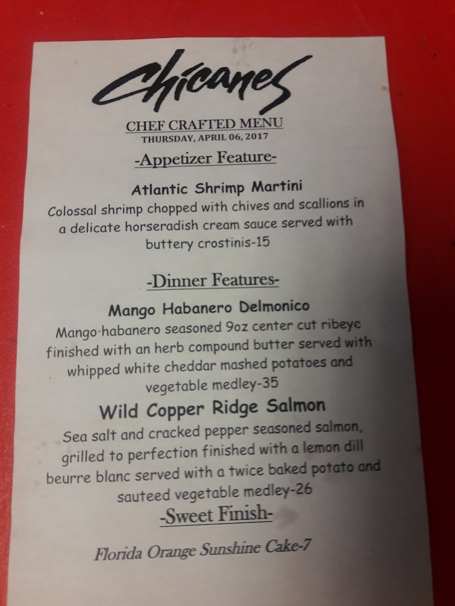 Chicanes Restaurant & Bar, your culinary escape nestled at 3101 Golfview Rd, Sebring, FL. Our menu is a delightful tapestry of flavors that showcases seasonal ingredients and classic preparations. Dive into our French Onion Soup for a rich, savory start, or savor the decadence of our creamy Creme Brulee to satisfy your sweet tooth. For seafood lovers, our Skillet Mussels and Cedar Plank Salmon offer a taste of the ocean that's hard to resist. Don’t miss out on our signature dishes like Chicken Marsala and the Turbo Burger, each crafted to tantalize your taste buds. Pair your meal with a refreshing Mojito or a glass of our house-made Sangria, and round off your dining experience with a luxurious Chocolate Martini. Whether you're in the mood for a casual dinner or a special celebration, the Chicanes Restaurant & Bar Menu has something for everyone!